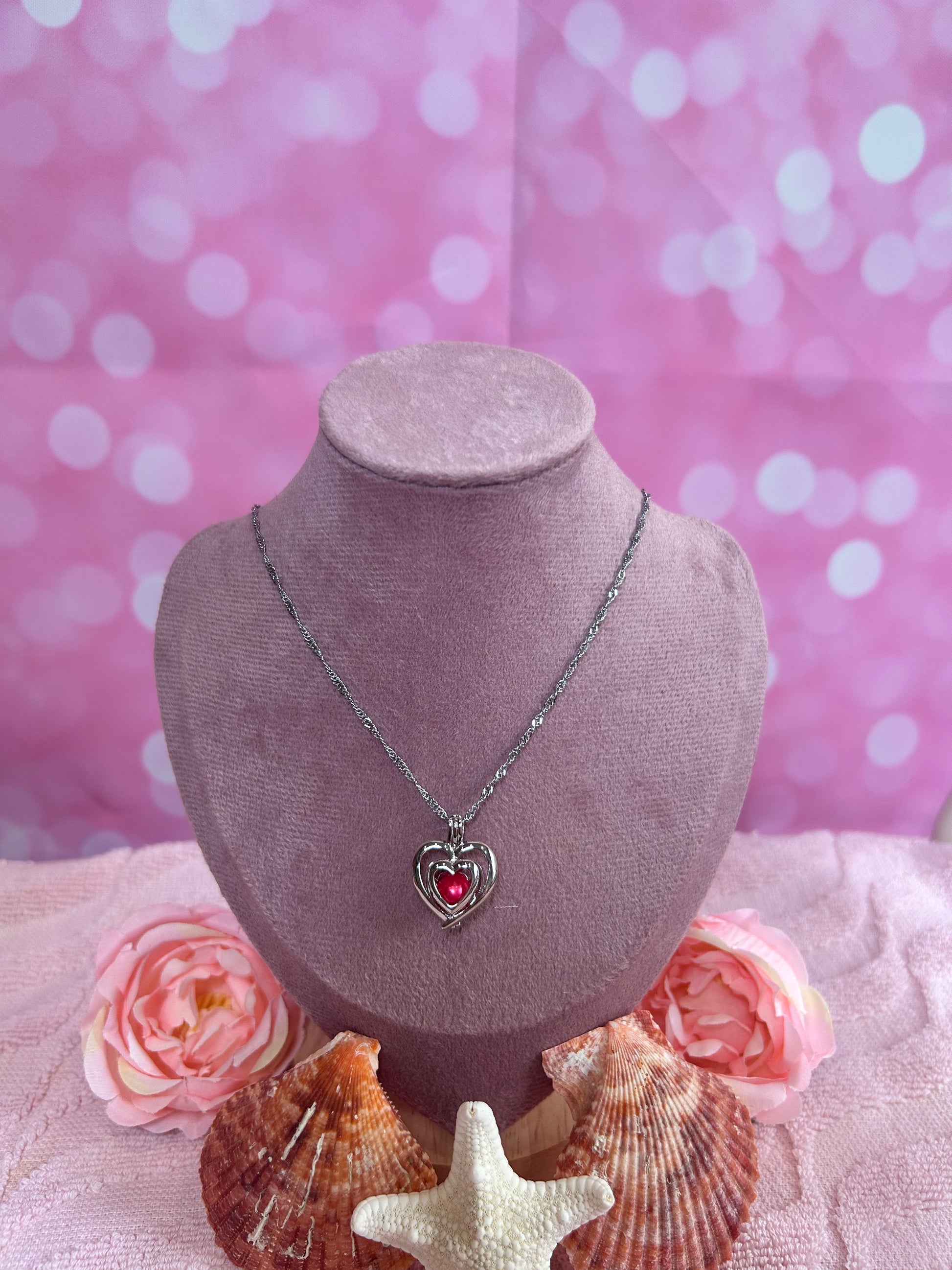 This heart cage comes with a round oyster opening and a chain